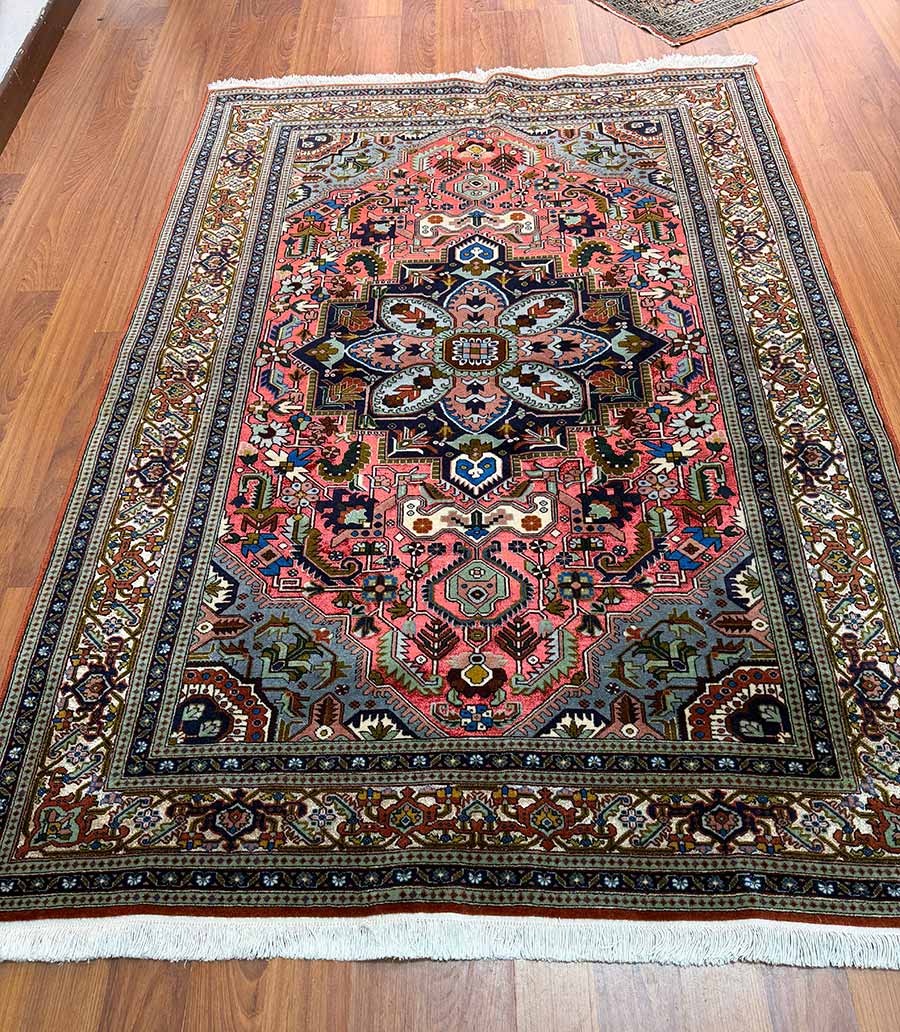 La bordura beige presenta un classico disegno Herati con girali vegetali e motivi floreali in varie tonalità, incorniciata da multiple guardie decorative che completano la composizione. L'effetto abrash, visibile nelle variazioni di colore del campo rosso, testimonia l'autenticità della tintura naturale e l'annodatura artigianale tradizionale, rendendo ogni tappeto un pezzo unico.