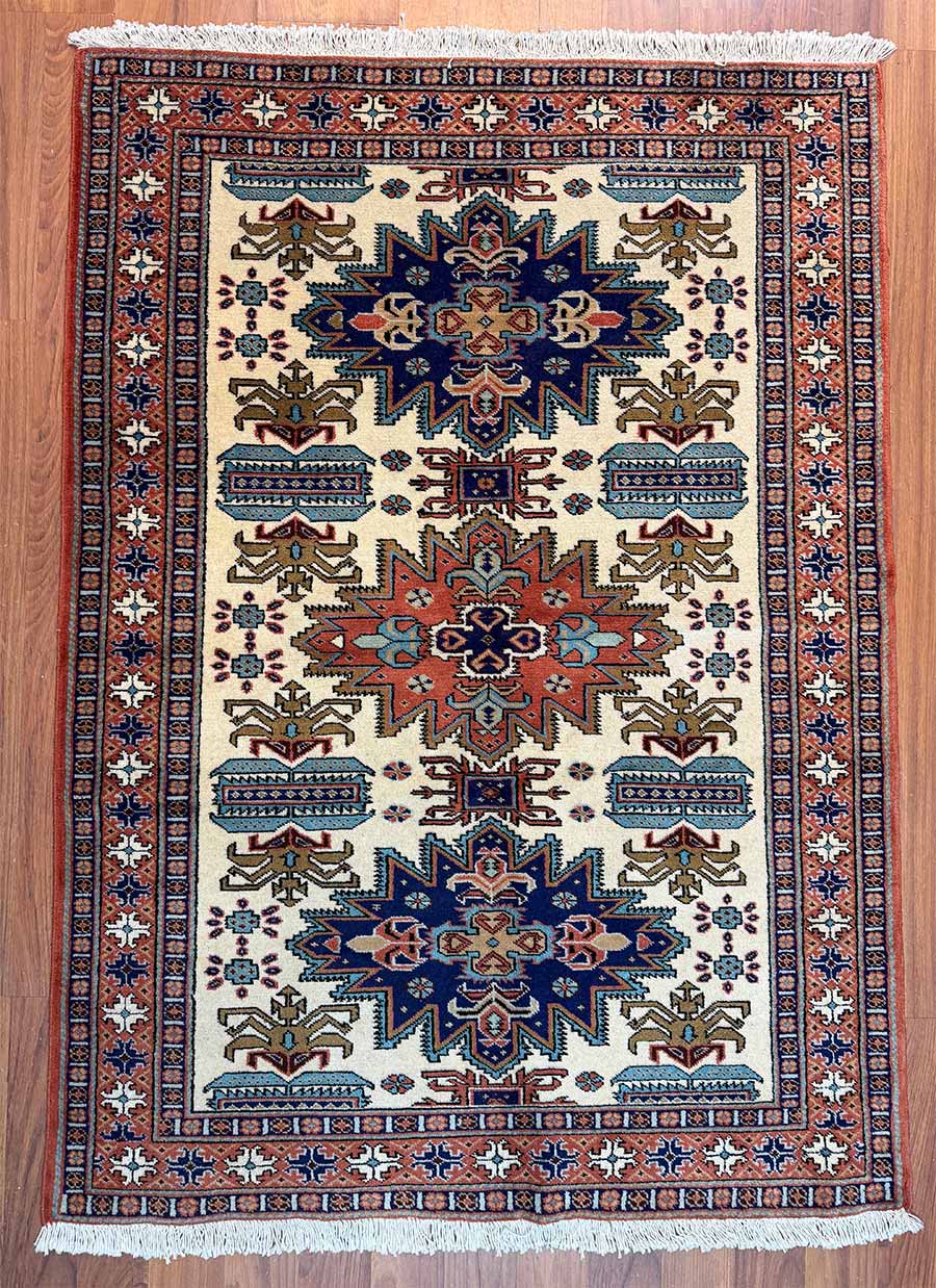 Elegante tappeto persiano Ardabil caratterizzato da un raffinato design geometrico a tre medaglioni centrali stellati. Il campo avorio luminoso fa risaltare i tre grandi medaglioni disposti verticalmente: uno blu navy nella parte superiore, uno terracotta al centro e uno blu intenso nella parte inferiore, ognuno impreziosito da elaborati motivi floreali e geometrici.​