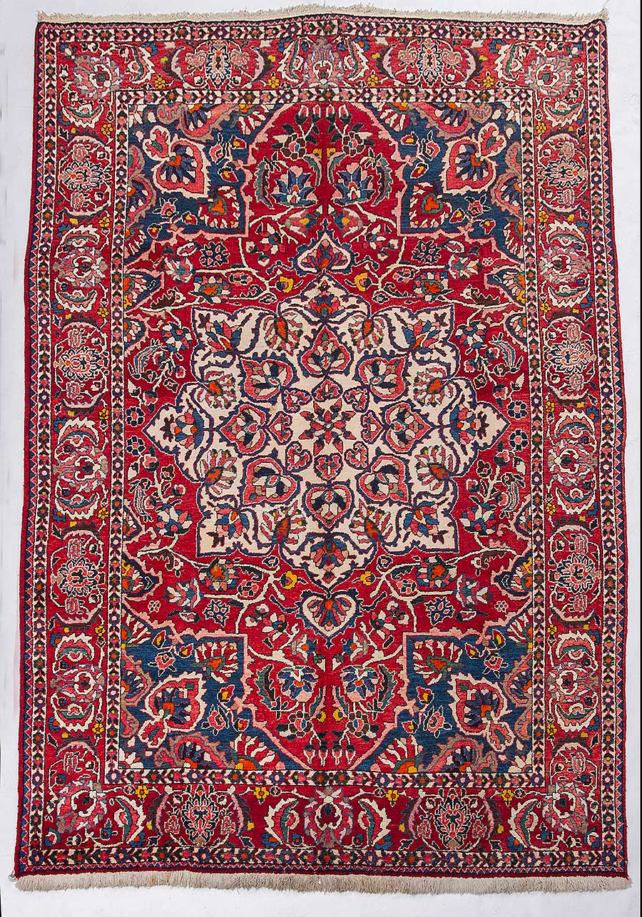 Autentico tappeto Bakhtiari persiano annodato a mano, con un magnifico campo rosso decorato da un grande medaglione centrale chiaro e motivi floreali intensi in blu, avorio e dettagli polÃcromi. Le cornici riccamente ornate esaltano la vivacità cromatica e l’originalità tipica delle migliori manifatture Bakhtiari, perfette per ambienti luminosi e accoglienti.