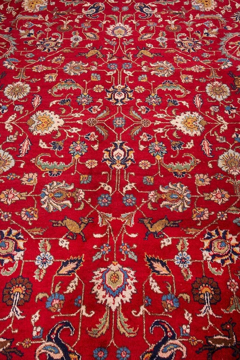 Autentico tappeto Tabriz persiano annodato a mano, con elegante fondo rosso intenso arricchito da un raffinato motivo a giardino di fiori e dettagli vegetali in colori caldi. La sofisticata cornice su sfondo avorio, decorata da infiorescenze e arabeschi, valorizza e illumina la composizione, creando equilibrio fra tradizione e freschezza cromatica.